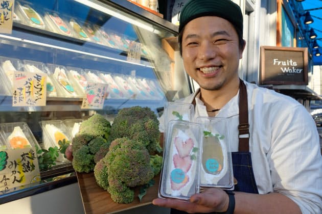 新潟市の観光施設内に2019年12月にオープンしたフルーツサンドイッチ店「フルーツウェイカー」。経営する本間純平さんが具材に使うのは、小売店で売れ残った野菜や果実だ。捨てられる運命だったものを正価で買い取り、写真映えするサンドに変身させる。そこには地域の農家を支えたいという強い思いがある。