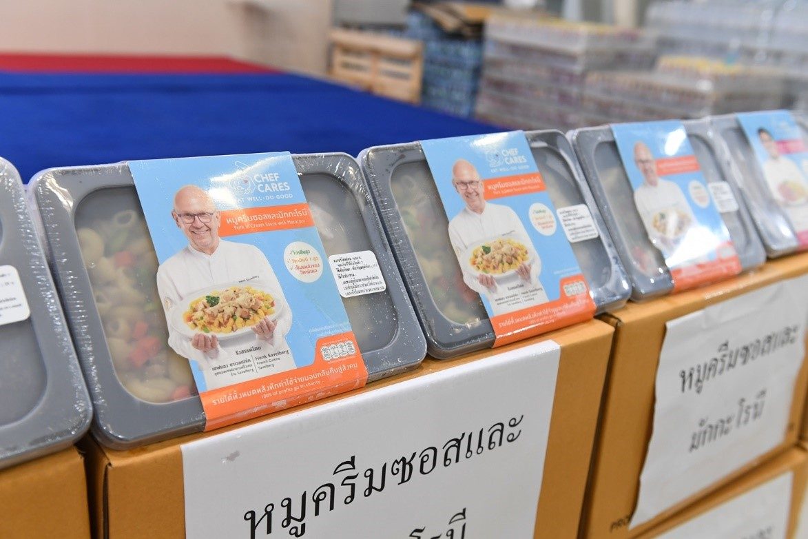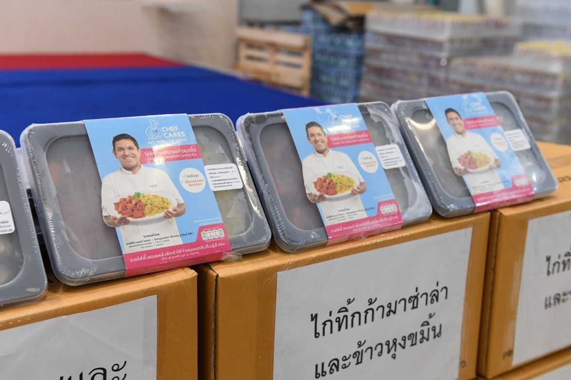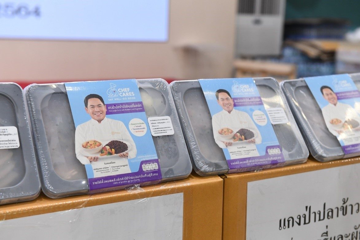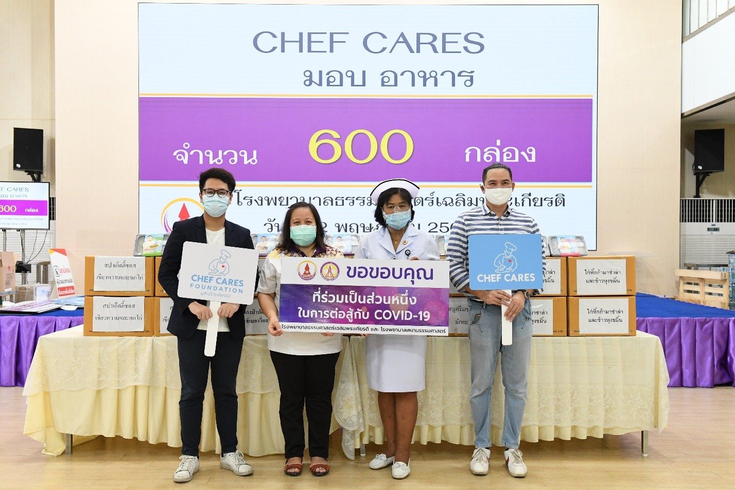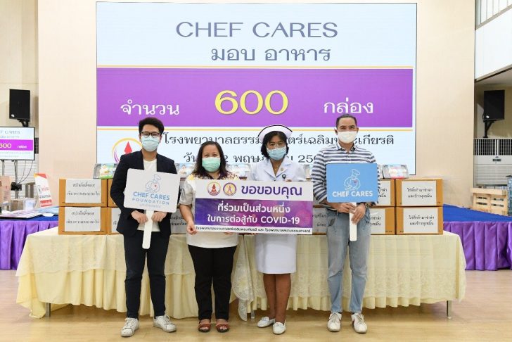 นางสาวเกศินี เอ็นดูราษฎร์ พยาบาลวิชาชีพ พร้อมด้วย นางณัฐกฤตา อ่อนธรรม หัวหน้างานการเงิน โรงพยาบาลธรรมศาสตร์เฉลิมพระเกียรติ ร่วมกันรับมอบผลิตภัณฑ์อาหารสุขภาพ “เชฟแคร์ส เรดดี้มีล” จำนวน 600 กล่อง จากผู้แทน มูลนิธิเชฟแคร์ส โดยนางมาริษา เจียรวนนท์ เพื่อแทนคำขอบคุณแก่ทีมแพทย์ พยาบาล และบุคลากรทางการแพทย์ ในการปฏิบัติภารกิจต้านภัยโควิด-19 ระลอกใหม่ ณ โรงพยาบาลธรรมศาสตร์เฉลิมพระเกียรติ โดยอาหารทั้งหมดเป็นอาหารจากเชฟฝีมือระดับโลก 4 เมนู ได้แก่ หมูครีมซอสและมักกะโรนี สปาเกตตี้ซอสเขียวหวานและอกไก่ แกงป่าปลาข้าวไรซ์เบอร์รี่ และไก่ทิกก้ามาซาล่ากับข้าวหุงขมิ้น