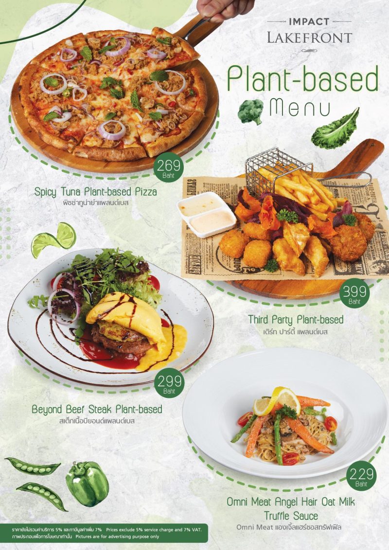 ค้นพบทางเลือกเพื่อสุขภาพที่ดีกับ 4 เมนูแพลนต์เบสคุณภาพจาก อิมแพ็ค เลคฟร้อนท์ ได้แก่ “พิซซ่าทูน่ายำแพลนต์เบส” ราคา 269 บาท พิซซ่าเตาถ่านสไตล์นโปเลียนที่ใช้ทูน่าแพลนต์เบสซึ่งมีรสชาติเหมือนเนื้อปลาทูน่าแท้ๆ นำไปยำให้ได้รสชาติจัดจ้านถึงเครื่องยำแบบไทย “เติร์ด ปาร์ตี้ แพลนต์เบส” ราคา 399 บาท เมนูรวมของทอดแพลนต์เบสแสนอร่อย 3 แบบในสไตล์ฟิวชั่น ให้รสชาติเหมือนเนื้อกุ้ง เนื้อปู หอมอร่อยแบบเต็มคำกรอบนอกนุ่มใน พร้อมมันทอดหลากสี และเฟรนช์ฟรายส์ เสิร์ฟพร้อมน้ำจิ้มบ๊วยและซอสสไปซี่มาโย “Omni Meat แองเจิ้ลแฮร์ซอสทรัฟเฟิล” ราคา 229 บาท เส้นสปาเก็ตตี้แองเจิ้ลแฮร์เหนียวนุ่มกำลังดีผัดกับเนื้อหมูแพลนต์เบสและนมโอ๊ตคุณภาพ นอกจากนี้ยังมีเห็ด มะเขือเทศเชอรี่ หน่อไม้ฝรั่ง และแครอท ปิดท้ายด้วย “สเต็กเนื้อบียอนด์ แพลนต์เบส” ราคา 299 บาท คัดสรรแพลนต์เบสที่ให้รสชาติเหมือนเนื้อวัว นำไปย่างให้หอม เสิร์ฟพร้อมซอสบัลซามิก สลัดผักสด ท็อปด้วยออมเล็ต